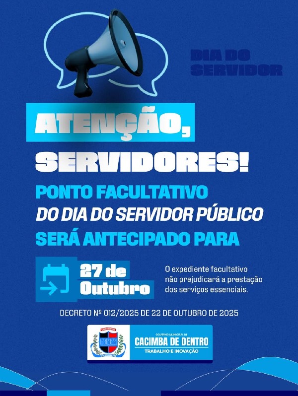 O Governo Municipal de Cacimba de Dentro informa que o Dia do Servidor Público será antecipado para a próxima segunda-feira, 27 de outubro.