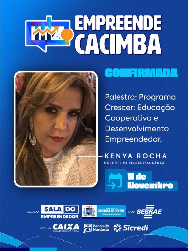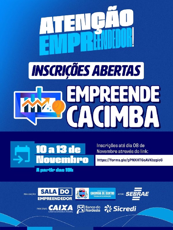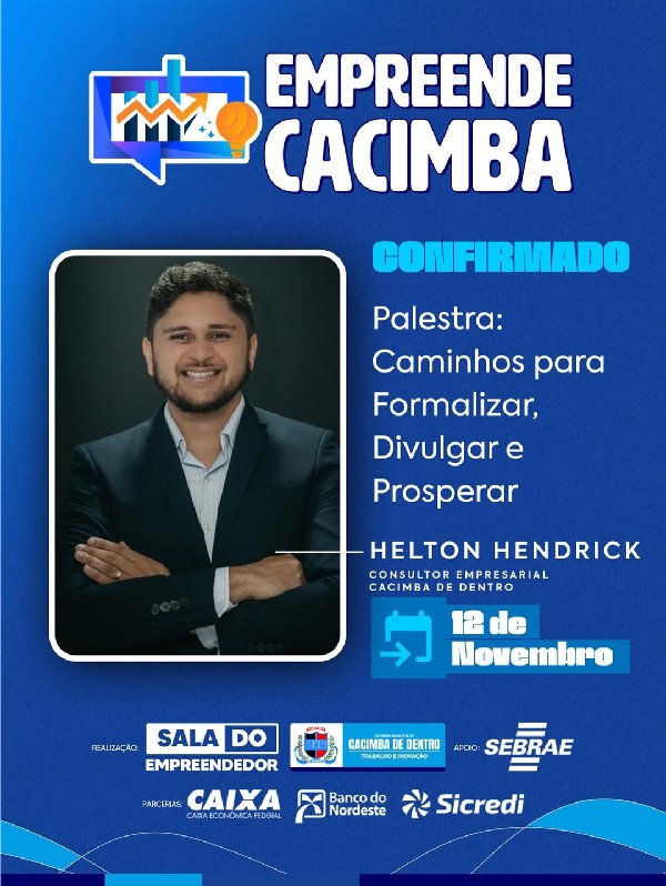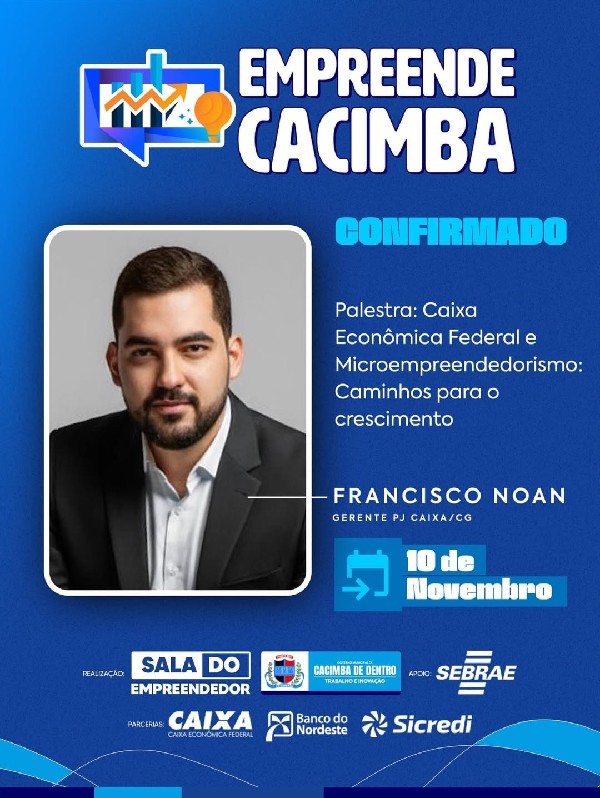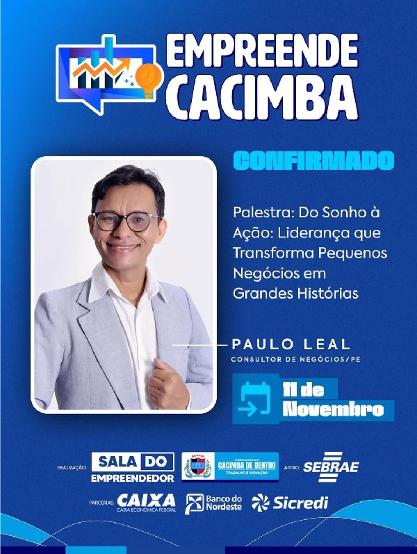 A oportunidade que você esperava chegou! Está chegando o Empreende Cacimba, um evento totalmente voltado para quem quer crescer, inovar e fazer networking com pessoas que acreditam no poder do empreendedorismo.