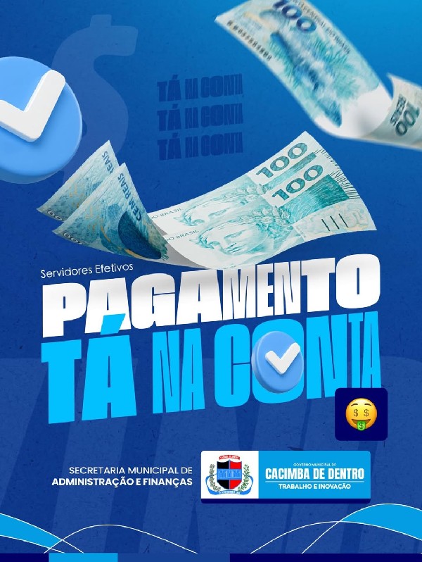 O Governo Municipal de Cacimba de Dentro informa que o pagamento dos servidores efetivos já foi creditado em conta. A ação reafirma o compromisso da gestão com a pontualidade e a valorização de todos os profissionais que contribuem diariamente para o bom funcionamento dos serviços públicos municipais.