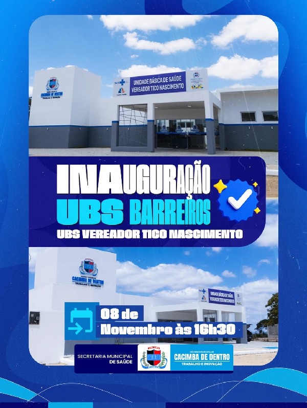 O Governo Municipal de Cacimba de Dentro convida toda a população para participar da inauguração da nova Unidade Básica de Saúde (UBS) de Barreiros - Tico Nascimento. O novo espaço foi construído com dedicação, planejamento e compromisso, visando oferecer mais qualidade de vida e atendimento humanizado à comunidade local.