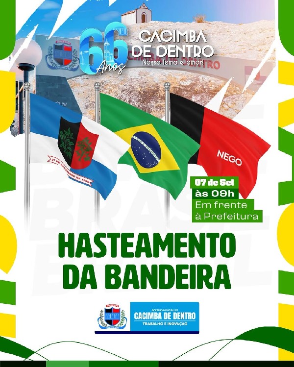 O Governo Municipal de Cacimba de Dentro tem a honra de convidar toda a população para participar da cerimônia de Hasteamento da Bandeira em comemoração ao Dia da Independência do Brasil.