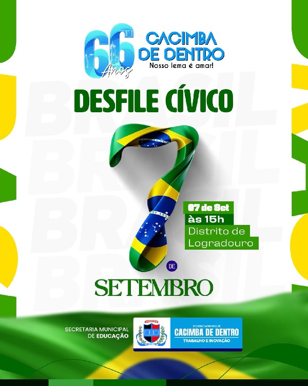 O Governo Municipal de Cacimba de Dentro, por meio da Secretaria Municipal de Educação, tem o prazer de convidar toda a população para prestigiar o tradicional Desfile Cívico em comemoração ao 7 de Setembro, que será realizado no Distrito de Logradouro.