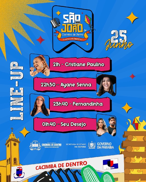 O Governo Municipal de Cacimba de Dentro tem a satisfação de anunciar as atrações que irão abrilhantar a noite de abertura do São João 2025, marcada para a quarta-feira, 25 de junho.