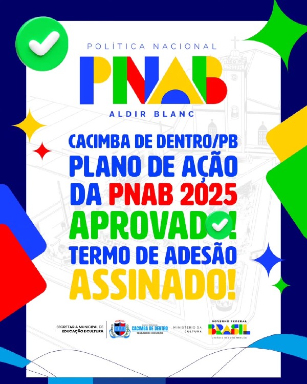A Prefeitura Municipal de Cacimba de Dentro, por meio da Secretaria de Educação e Cultura, concluiu com êxito mais uma etapa fundamental para o fortalecimento das políticas culturais do município: a assinatura do Termo de Adesão à Política Nacional Aldir Blanc (PNAB) para o quadriênio 2025-2028.
