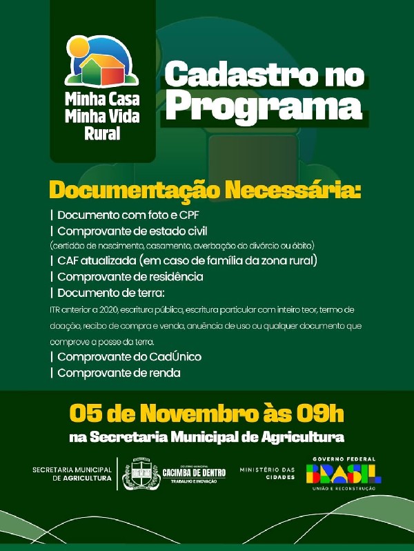 O Governo Municipal de Cacimba de Dentro, por meio da Secretaria Municipal de Agricultura, informa que o cadastramento para o Programa Minha Casa, Minha Vida Rural será realizado nesta quarta-feira, 05 de novembro, a partir das 9h, na sede da Secretaria.