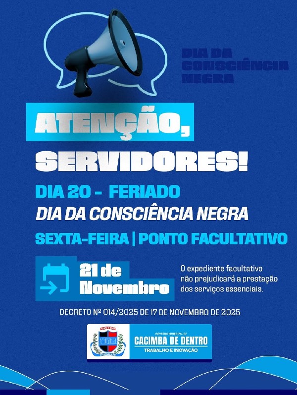 O Governo Municipal de Cacimba de Dentro informa que as repartições públicas municipais estarão em ponto facultativo na sexta-feira, 21 de novembro de 2025, em razão do feriado nacional do Dia da Consciência Negra, celebrado no dia 20 de novembro.